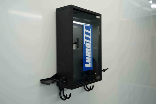 All metal enclosure with 2 tiers of shelving and 4 hooks for paint guns & extra bottles.