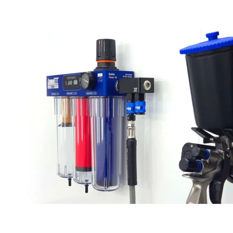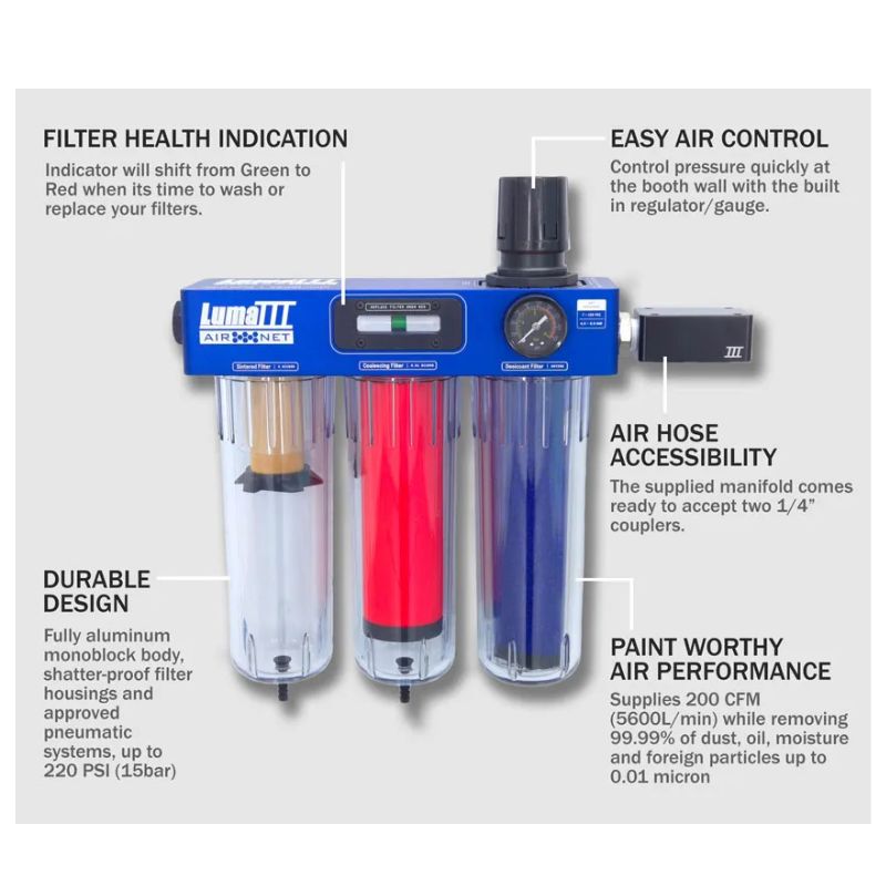 The Luma III AIR-NET is a 3-Stage Paint Filtration system with built in regulation.
